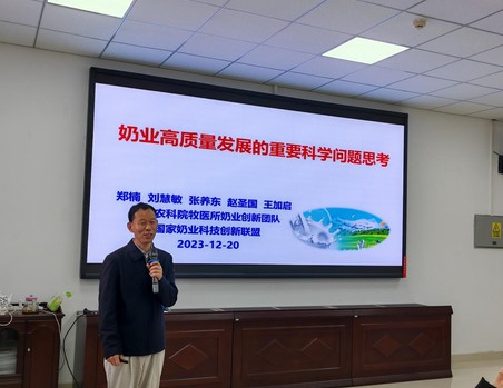 学术报告会上,王加启研究员以“奶业高质量发展的重要科学问题思考”为主题,从二十大习近平总书记提出的高质量发展是全面建设社会主义现代化国家的首要任务,延伸到优质乳工程是奶业高质量发展的引领者,从全产业链的角度分析了饲料营养、饲料转化效率到牛奶品质、健康低碳的转化过程,提出蛋白质饲料的科学利用是奶业生产系统中面临的重大科技挑战;简要介绍了奶业创新团队围绕“奶牛瘤胃微生物尿素利用和瘤胃模拟装置的研发”方面开展的主要工作及取得的成效,攻克了脲酶蛋白复合体共表达难题,揭示了脲酶结构蛋白形成三聚体活性中心,为脲酶抑制剂开发提供了靶标,实现了瘤胃脲酶抑制剂从化学合成到植物提取物的转变,2023年获批准为新饲料添加剂;从社会、消费者、企业、国家的层面阐述了什么是一杯好奶,建立奶业高质量发展的科学理念--优质奶只能产自本土奶。交流会上,双方围绕如何聚焦自治区奶业振兴深入开展科研合作、科技成果转化、研究生培养等方面进行了交流,拓展了我院师生在奶产业特别是特色奶方面的研究思路。
